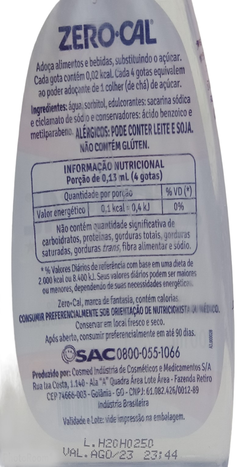 Valor energético para 0,1kcal = 0,4kJ (0% VD*); Não contém quantidade significativa de carboidratos, proteínas, gorduras totais, gorduras saturadas, gorduras trans, fibra alimentar e sódio. *% Valores Diários de referência com base em uma dieta de 2.000 kcal ou 8400 kJ. Seus valores diários podem ser maiores ou menores dependendo de suas necessidades energéticas.